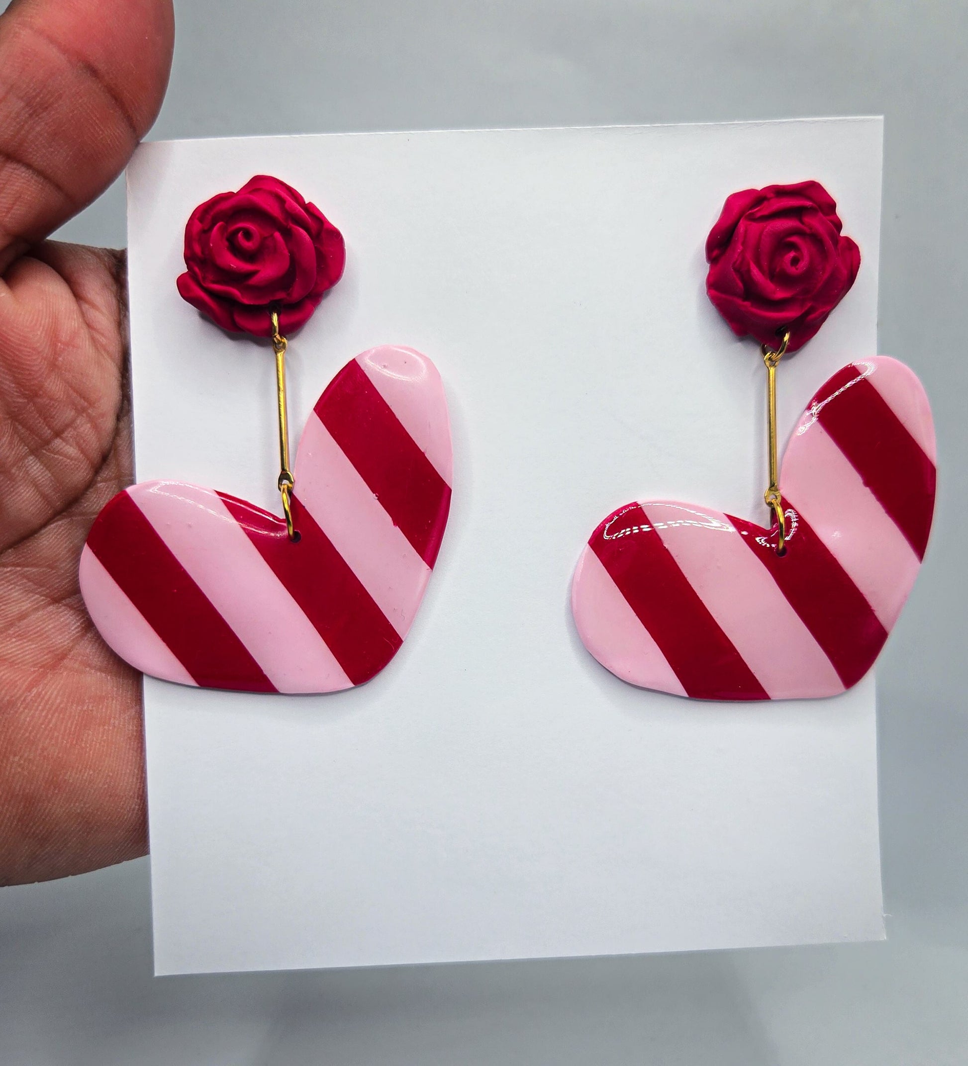 Red and pink heart shaped stripe and rose dangle earrings